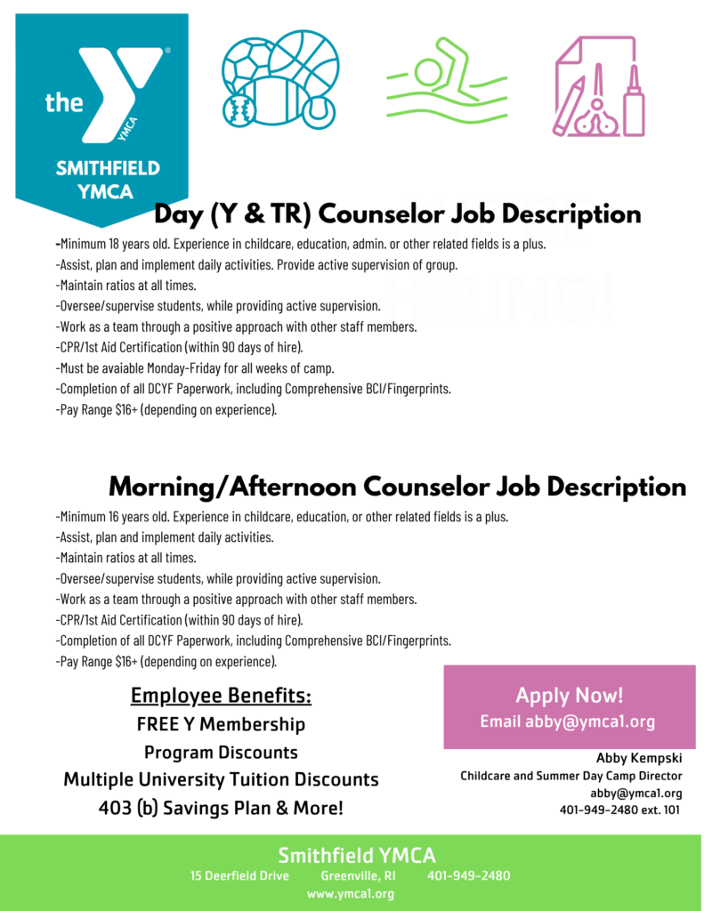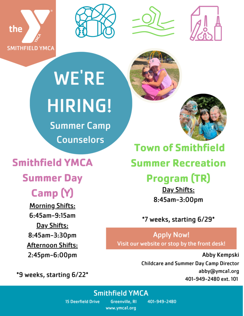We are looking for Summer Camp Counselors for both The Smithfield YMCA Summer Camp and Smithfield Town Rec Summer Camp