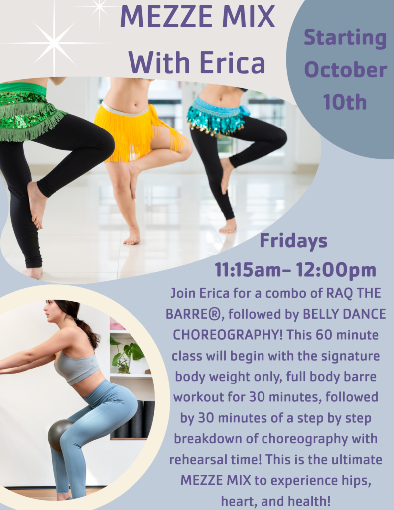 MEZZE MIX: A combo of RAQ THE BARRE®, followed by BELLY DANCE CHOREOGRAPHY! This 60 minute class will begin with the signature body weight only, full body barre workout for 30 minutes, followed by 30 minutes of a step by step breakdown of choreography with rehearsal time! This is the ultimate MEZZE MIX to experience hips, heart, and health!