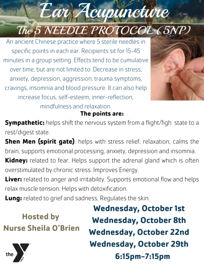 5NP Ear accupuncture– An Ancient Chinese practice where 5 sterile needles are placed in specific points in the ear. Recipients will sit for 15-45 minutes in a relaxing group setting. Decreases stress, anxiety, insomnia, depression, cravings, blood pressure and trauma symptoms.